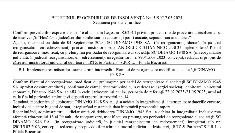 SC Dinamo 1948 SA a depus, sub semnătura administratorului special Andrei Nicolescu, raportul trimestrial numărul XIII, valabil pentru  perioada 22 noiembrie 2024- 21.02.2025. ProSport vă prezintă, în exclusivitate, radiografia financiară a societății care se află în insolvență, pentru a doua oară de la înființare, încă din 2021.