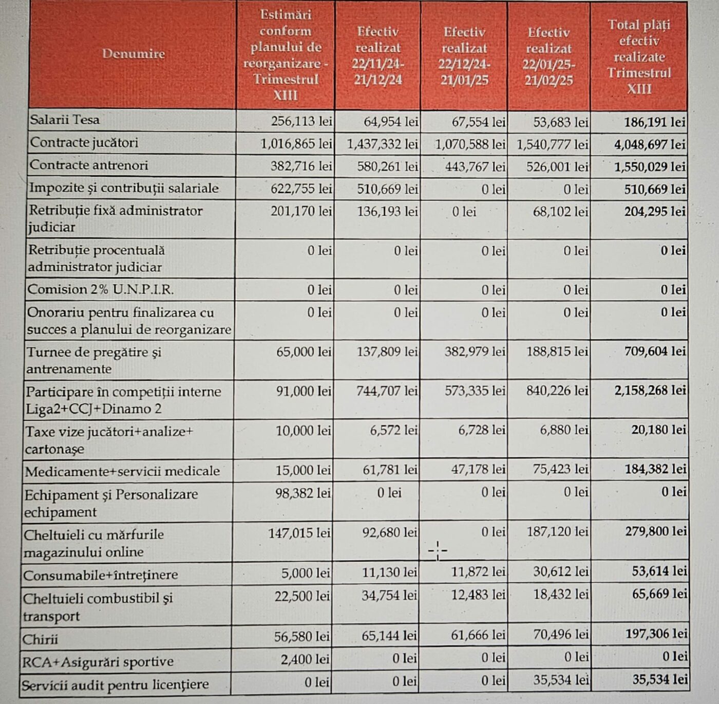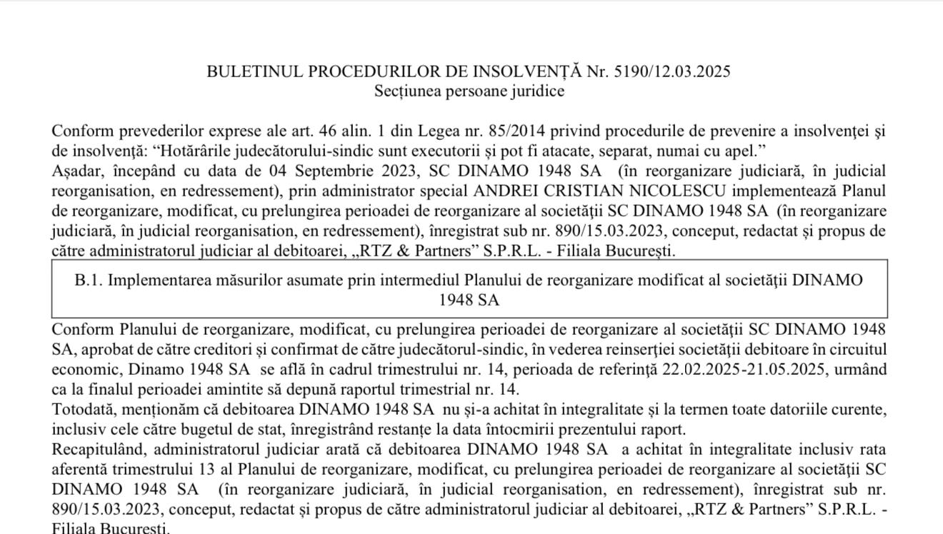 Dinamo a realizat, conform graficului de plăți din Planul de reorganizare aprobat de judecătorul sindic în septembrie 2023 și plățile către bugetul de stat din rata aferentă trimestrului XIII, 515,136,50 lei.