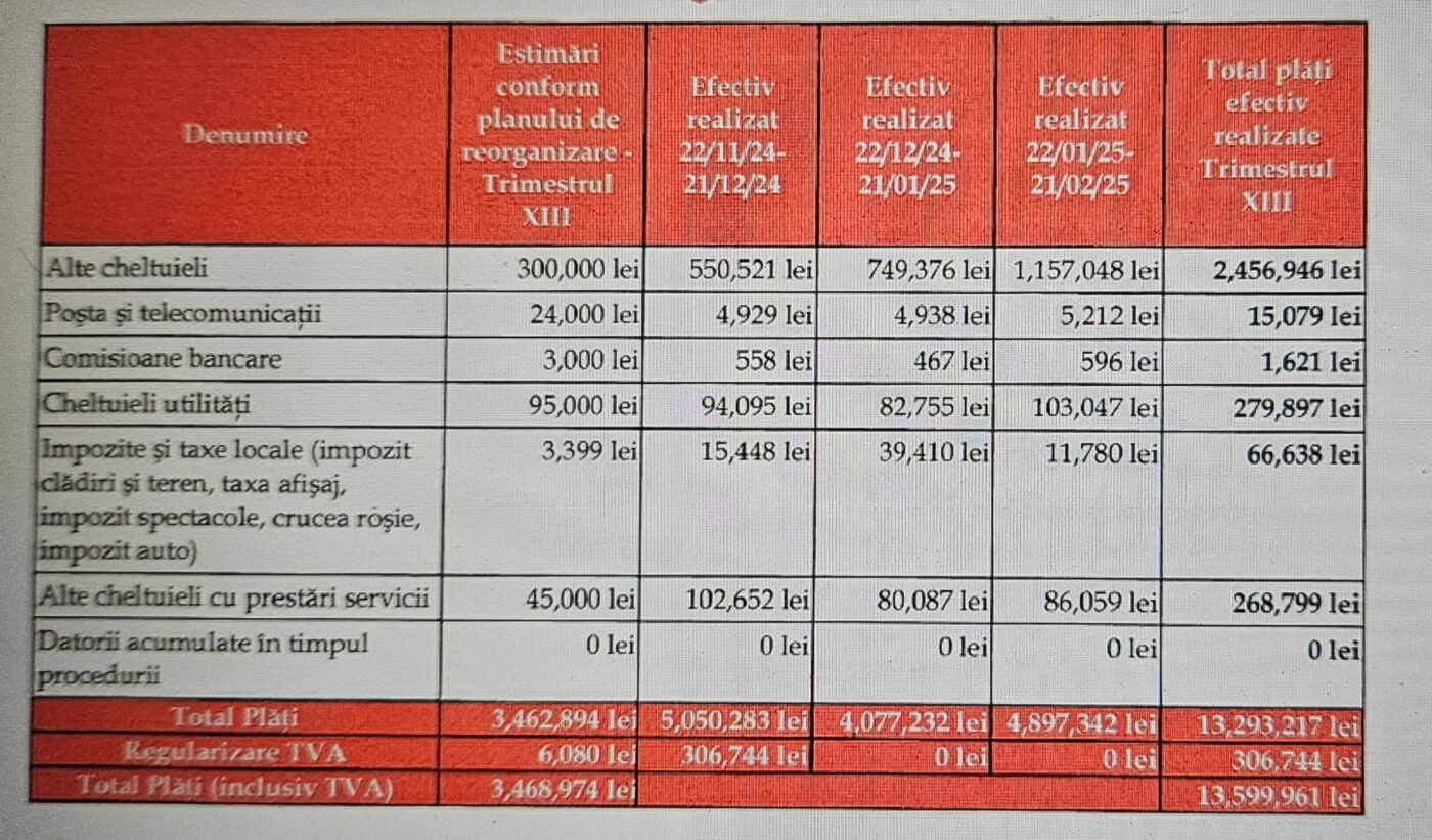 În această perioadă, societatea aflată în insolvență din vara lui 2021 a realizat venituri în valoare de 13,737,904 lei. Aceste încasări au fost colectate din următoarele surse: