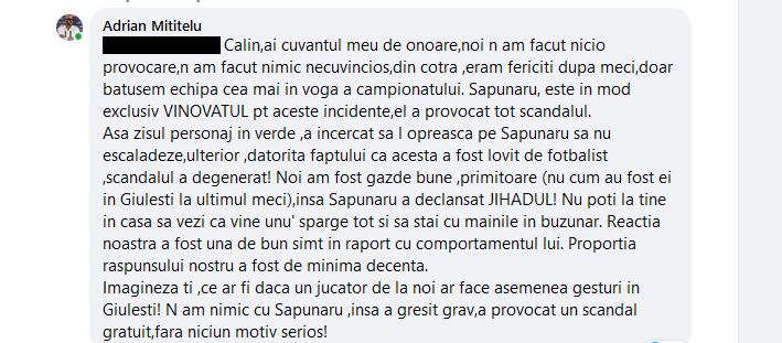 Imaginează-ți, ce ar fi dacă un jucator de la noi ar face asemenea gesturi în Giulești! N am nimic cu Săpunaru, însă a greșit grav, a provocat un scandal gratuit, fără niciun motiv serios!” a scris Adrian Mititelu pe pagina sa de Facebook, ca răspuns al unei postări.