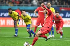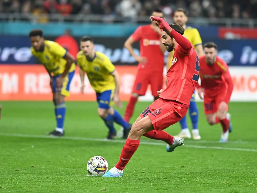 Andrea Compagno execută o lovitură de la 11 metri, în meciul dintre FCSB și Petrolul