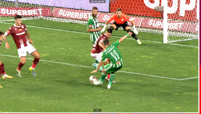 Este greu de precizat dacă atinge sau nu mingea cu vârfurile degetelor, dar având în vedere că în prima instanță are loc un contact cu piciorul, decizia lui Feșnic este cea corectă, de altfel fiind confirmată din cabina VAR de către Iulian Dima.