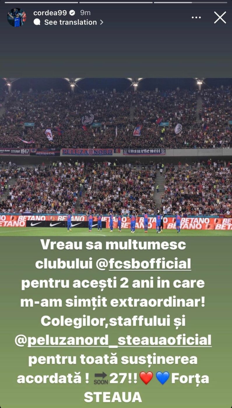 „Vreau să mulțumesc clubului FCSB pentru acești doi ani în care m-am simțit extraordinar! Colegilor, staff-ului și Peluzei Nord pentru toată susținerea acordată! În curând, 27 (n.r. referitor la titlul cu numărul 27 pe care l-ar putea câștiga FCSB în acest sezon)! Forța Steaua!”, a scris Andrei Cordea, pe Instagram