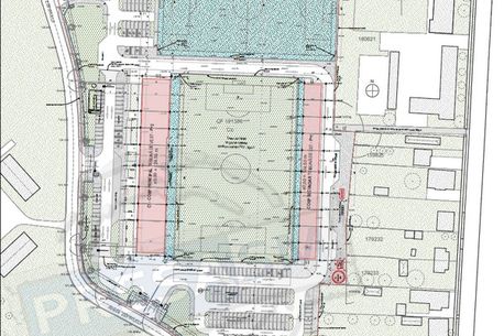 Proiectul noului stadion prevede construirea a două terenuri de fotbal, un teren principal, cu gazon natural, omologabil pentru prima ligă, cu dimensiunile 68X105 metri, respectiv un teren secundar, de antrenament, cu gazon artificial (60X105 metri), ambele cu zone de proiecție.