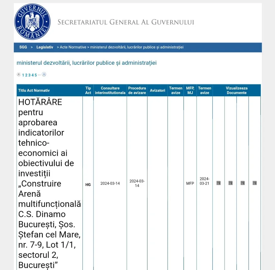 Arena Multifuncțională Dinamo intră în linie dreaptă spre aprobarea investiției pentru construcție și, în prealabil, demolarea actualului amplasament. ProSport a aflat date noi despre stadiul birocratic al demersului, iar joi a fost publicată „Hotărârea pentru aprobarea indicatorilor tehnico- economici ai obiectivului de investiții „Construire Arenă multifuncțională CS Dinamo București, Șoseaua Ștefan cel Mare nr. 7-9, Lot 1/1, sector 2, București”.