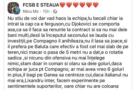 „Pe Compagno îl anihilează, nu îl lasă să joace și îl preferă pe Băluță care a fost cel mai slab de pe teren, nici măcar o pasă de 5 metri nu a da, e o rotație sadică și nici din ofensivă nu mai înțeleg nimic. Stăm doar în Coman și Olaru să dea goluri. Dacă ar juca pentru Compagno ar avea vreo 6 goluri în plus”, a scris un fan al celor de la FCSB pe contul „FCSB e Steaua”.(VEZI FOTO ÎN GALERIE).