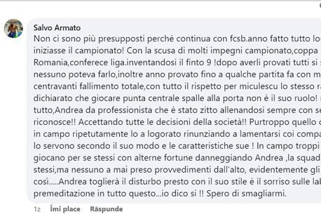 În ciuda a toate aceste lucruri, Andrea a fost un profesionist care a tăcut și s-a antrenat mereu cu o seriozitate pe care trebuie să o recunoaștem. Acceptăm toate deciziile clubului. S-a văzut pe teren, a fost folosit în mod repetat, dar nu s-a plâns niciodată coechipierilor care nu-l servesc, după modul și caracteristicile lui.