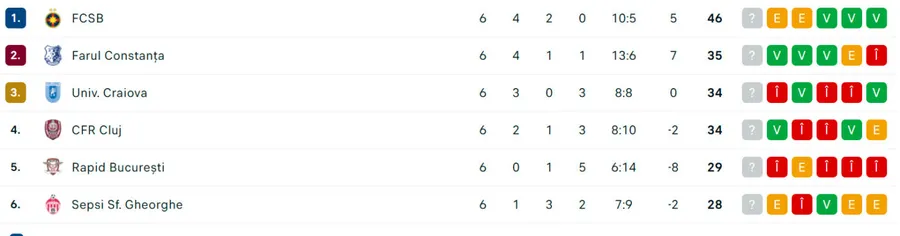 FCSB este lider în Superligă, cu 46 de puncte, fiind urmată de campioana Farul cu 35 de puncte. De altfel, echipa manageriată de Gică Hagi este singura care mai are șanse teoretice să ia titlul în acest sezon.