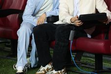 Tavi Popescu și Adrian Șut s-au amuzat la marginea terenului și au umblat pe tableta staff-ului, înainte de Dinamo – FCSB.