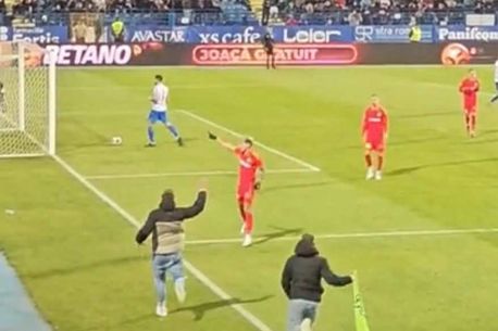 Imediat după ce a transformat unul dintre penalty-uri, fotbalistul de la FCSB a mers, așa cum se întâmplă de obicei în astfel de situații, spre colțul terenului pentru a se bucura.