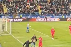 Atunci, doi suporteri ai echipei roș-albastre, fapt ce reiese din modul în care aceștia s-au manifestat în acele momente, au sărit în teren și au mers spre cel poreclit „Mbappe”, pentru a celebra împreună cu el.