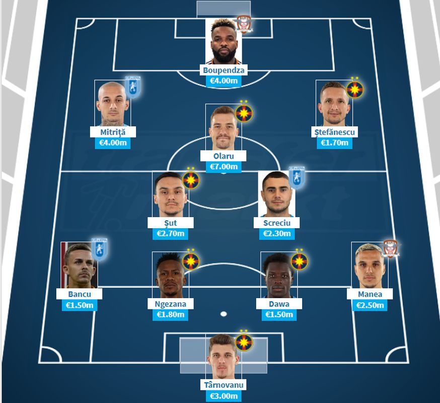 Care este cel mai valoros prim 11 al campionatului intern, bazat pe cifrele furnizate de transfermarkt.com? FCSB furnizează șase jucători în echipa ideală, trei sunt de la Universitatea Craiova și doi de la Rapid, cu mențiunea că Boupendza nu a debutat la echipa giuleșteană.