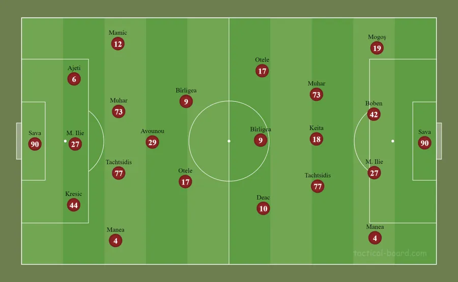 • Când stăpâneștii fizic adversarul prin Muhar, Tachtsidis, Bîrligea sau Mogoș, îți asumi însă un tempo redus și greu de convertit în construcție ofensivă eficientă