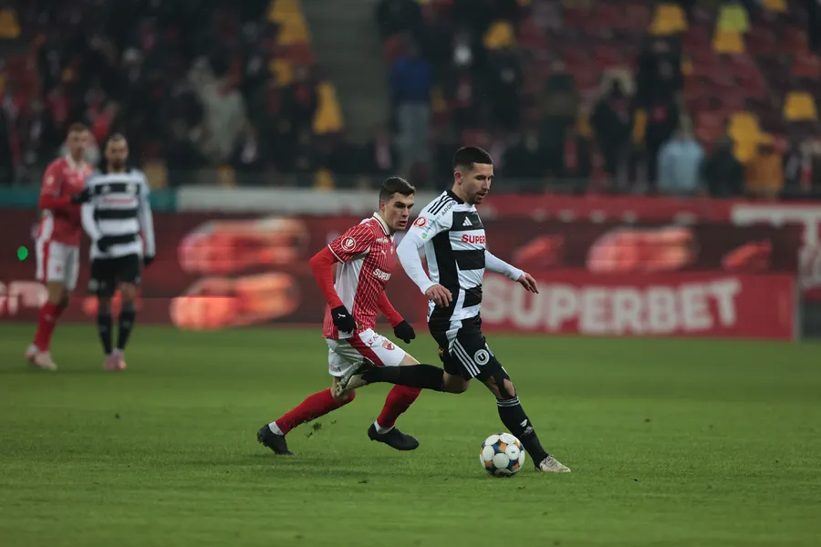 Starea de fotbal în oglindă continuă. Același Macalou șerpuiește și încheie cu centrare optimă pe jos, în zona „cod roșu de gol”, n-are coechipier cu plasament pe măsura acțiunii. Cîrjan trimite din stânga, mai puternic și lovește gleznele stoperilor alb-negri în același spațiu esențial în care orice ezitare în respingere poate stârni cutremurul.