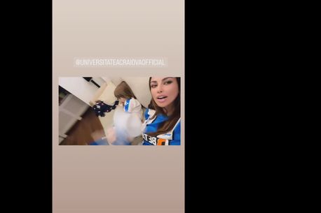 În secțiunea de Insta Story a paginii ei de Instagram, Mădălina Ghenea a încărcat, vineri seară, 12 aprilie, cu ocazia meciului Universitatea Craiova – Farul Constanța, mai multe clipuri sugestive. Ea a urmărit meciul la televizor, însă nu oricum, ci îmbrăcată în echipamentul Universității Craiova și fluturând un steag în culorile și cu emblema oltenilor.