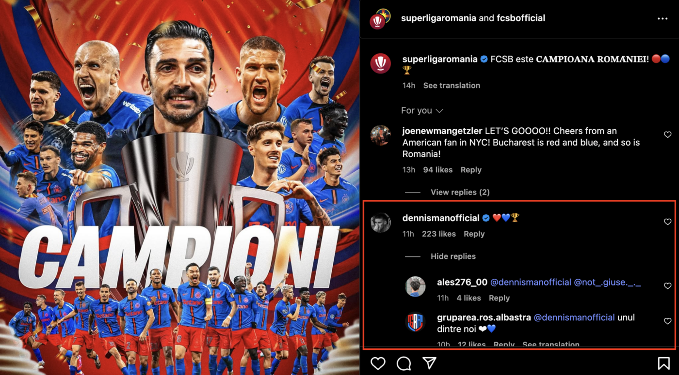Dennis Man (26 de ani) nu a uitat de echipa care l-a propulsat în fotbalul mare, în afara granițelor mai precis, și a reacționat scurt și la obiect imediat după ce FCSB a câștigat titlul.