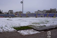 Stadionul Municipal din Botoșani e plin de zăpadă înaintea meciului restant cu FCSB din a 4-a etapă a Superligii.