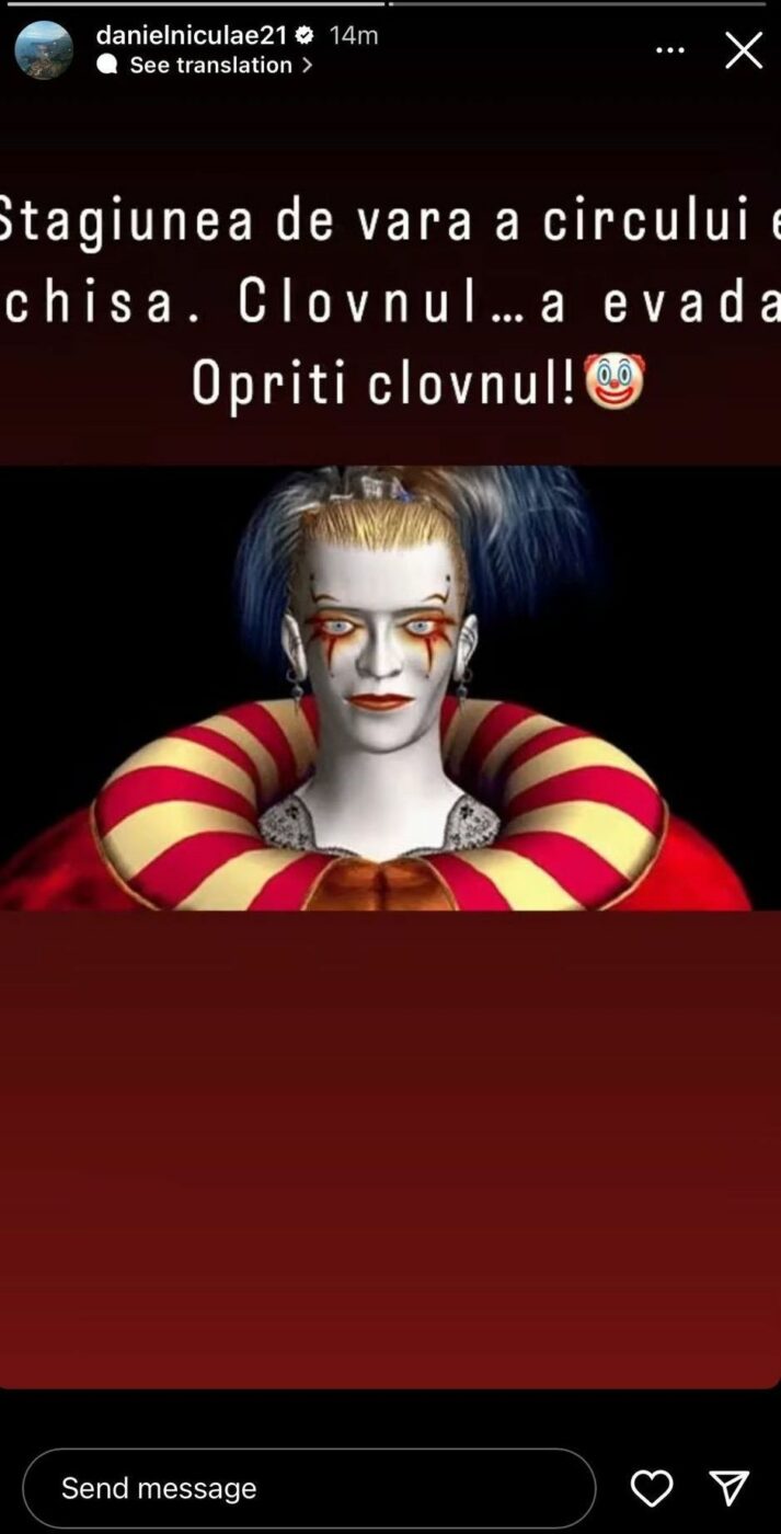 „Stagiunea de vara a circului e închisă. Clovnul a evadat! Opriți clovnul!”, a scris târziu în noapte Daniel Niculae pe Instagram, mesajul fiind alăturat unei fotografii cu un clovn.