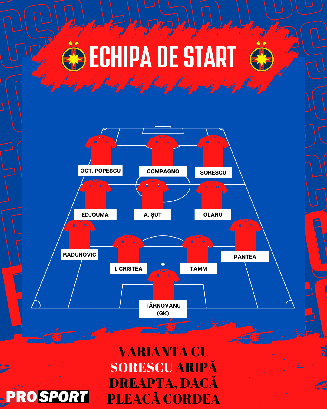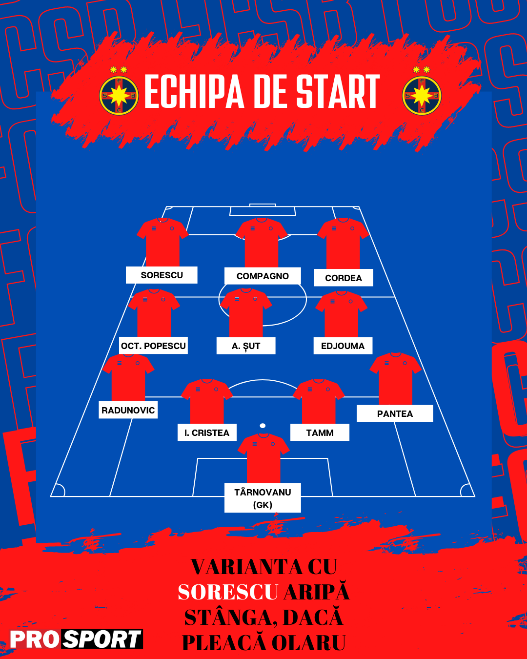 ProSport vă prezintă cum ar putea arăta primul 11 al celor de la FCSB în partea a doua a sezonului, în trei variante diferite, cu Deian Sorescu în teren.