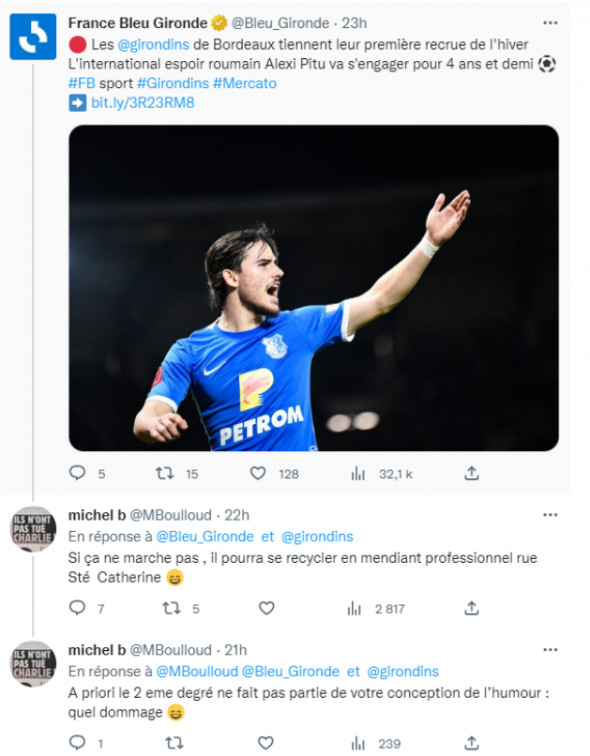 Michel Boulloud, fostul consilier al orașului Lesparre-Medoc, a avut o reacție incredibilă la adresa lui Alexi Pitu la scurt timp după ce fotbalistul român a semnat cu Bordeaux. „Dacă nu reușește cu fotbalul, Pitu se poate reprofila ca și cerșetor profesionist”, a scris acesta Michel Boulloud, fostul consilier al orașului Lesparre-Medoc, pe Twitter.