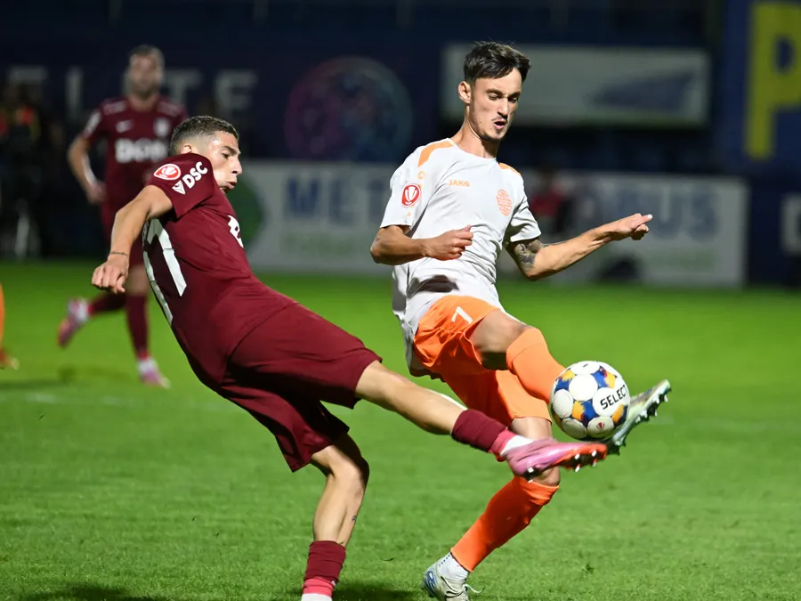 Laurențiu Liș (foto jos, într-un meci cu CFR Cluj) are 21 de ani, cu unul mai puțin decât Tavi Popescu. A ajuns în 2022 la Metaloglobus, de la Academica Cliceni. Cota lui de piață? Doar 25.000 de euro! În vreme ce transfermarkt îl păstrează încă pe Tavi la 1,4 milioane euro!