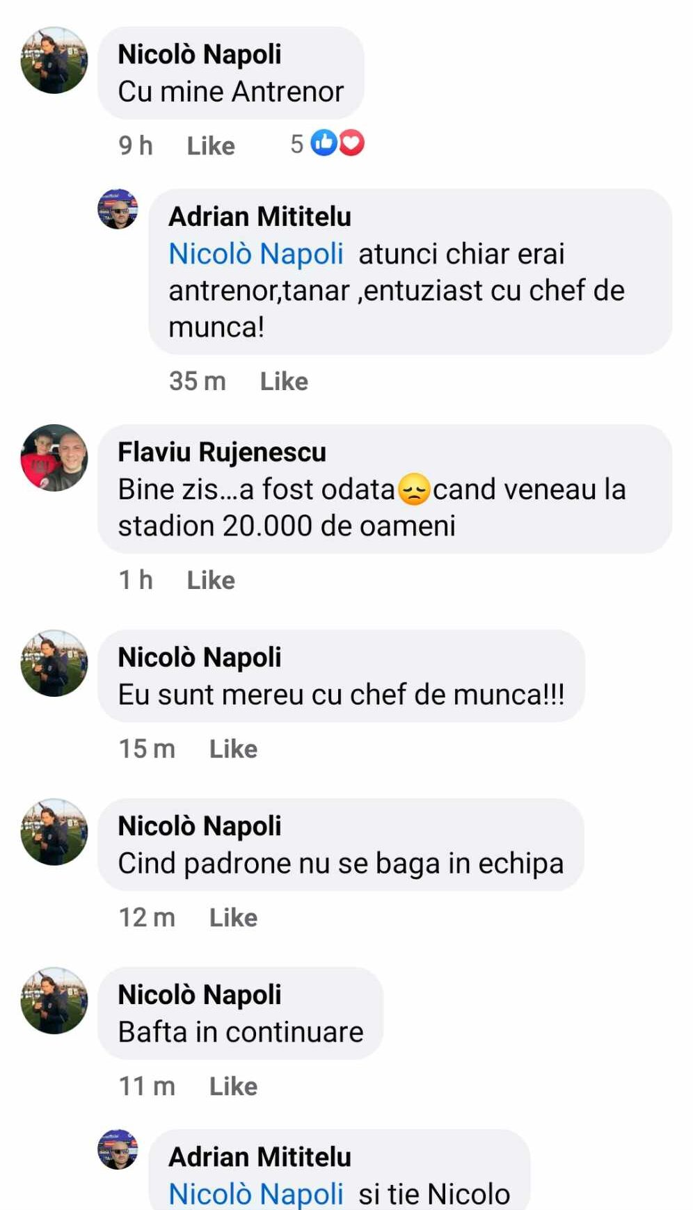 Nicolo Napoli, despre care se știe foarte bine că a antrenat echipa lui Mititelu de nu mai puțin de 9 ori, a comentat la această postare și a ținut să readucă în atenție faptul că el se afla pe banca tehnică la acea partidă memorabilă pentru olteni.