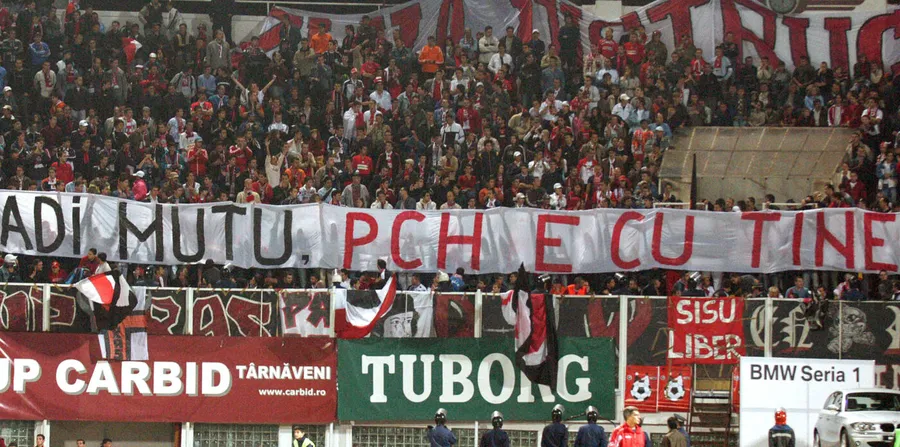 În peluză, entuziasmați că favoriții conduc cu 1-0, fanii dinamoviști își manifestau susținerea pentru Adrian Mutu, care fusese depistat pozitiv la un control antidoping în timp ce îmbrăca tricoul lui Chelsea: