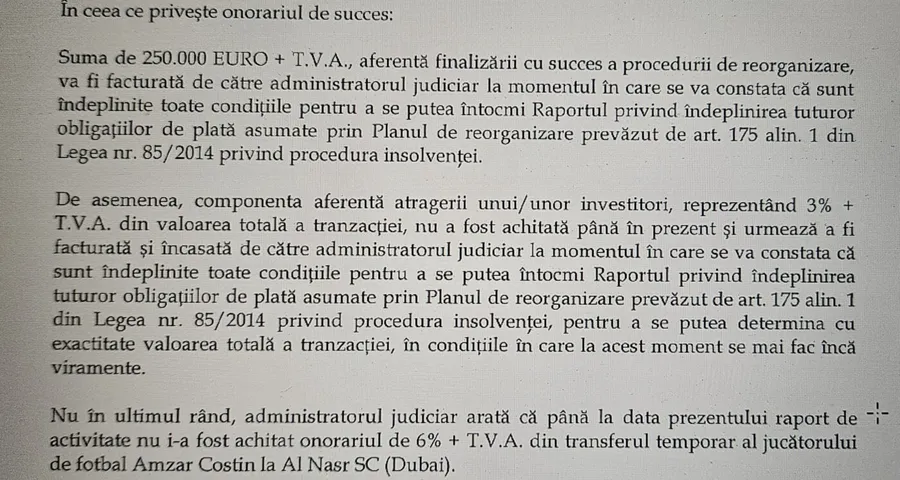 Acestor sume se adaugă și onorariul de succes al administratorului judiciar, RTZ & Partners SPRL. Este vorba de 250.000 de euro și aici intervine un detaliu foarte interesant prezentat în exclusivitate de ProSport.