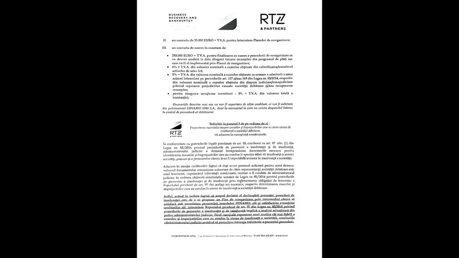 Conform  înțelegerii inițiale semnată în 2021, atunci când RTZ a preluat supravegherea procesului de reorganizare judiciară în care a intrat SC Dinamo 1948 SA, administratorului judiciar i se cuvin, în caz de succes, pe lângă cei 250.000 euro menționați mai sus și o cotă de 3%, plus TVA,  „pentru atragerea unui/unor investitori” din, atenție, „valoarea totală a tranzacției”.