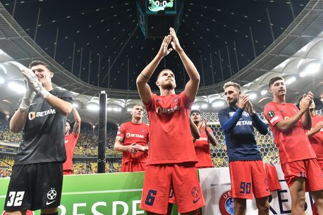 Fotbalistii stelisti Darius Dumitru Olaru, Denis Gratian Harut, Razvan Constantin Oaida, Marco Alexandru Dulca, Eduard Gabriel Radaslavescu si Radu Stefanita Boboc suparati dupa meciul de fotbal dintre CS Mioveni si FCSB, contand pentru Superliga Superbet, desfasurat pe Stadionul Orasenesc din Mioveni, sambata 6 august 2022. © FOTO:Razvan Pasarica/SPORT PICTURES