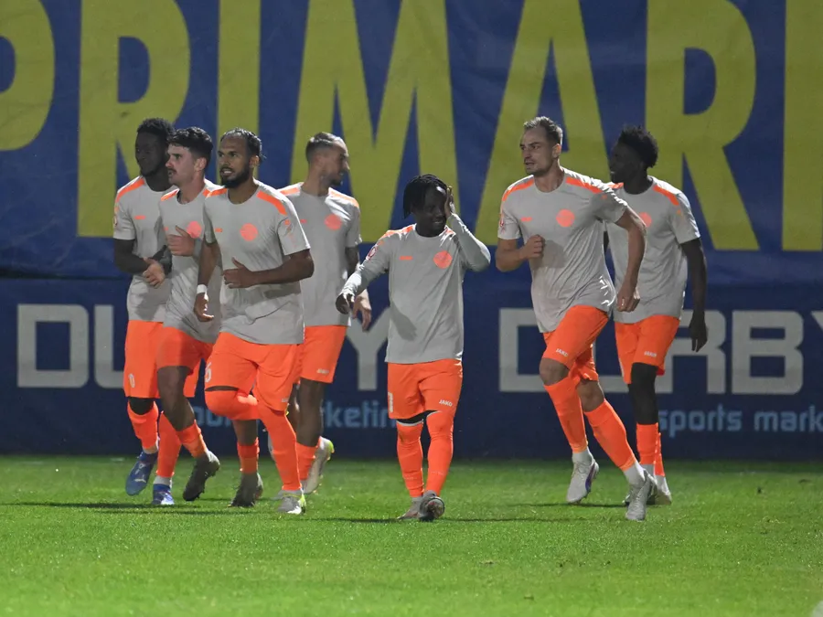 Fotbalistii harghiteni se bucura dupa un gol marcat de Soufiane Jebari in meciul de fotbal dintre AFC Hermannstadt Sibiu si FK Csikszereda Miercurea Ciuc, contand pentru Superliga Superbet, desfasurat pe Stadionul Municipal din Sibiu, luni 20 octombrie 2025. © FOTO:Valentin Macrea/SPORT PICTURES