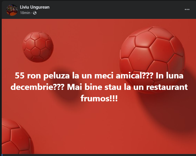 „55 ron peluza la un meci amical??? În luna decembrie??? Mai bine stau la un restaurant frumos!!!”, a fost mesajul lui Liviu Ungureanu, zis „Bocciu”.
