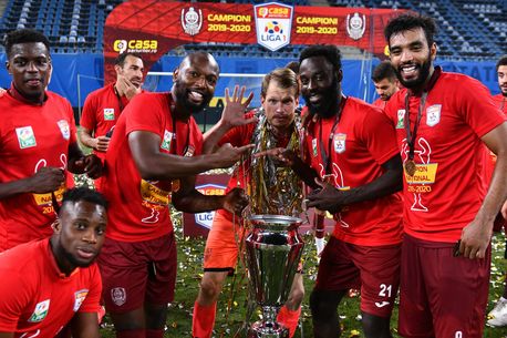 Michael Pereira, Yacouba Sylla, Mike Cestor, Giedrius Arlauskis, Kevin Boli si Billel Omrani pozeaza alaturi de trofeu dupa castigarea titlului de campioana in urma meciului de fotbal dintre Universitatea Craiova si CFR Cluj, contand pentru play-off-ul Ligii 1 Casa Pariurilor, disputat fara spectatori pe Stadionul Ion Oblemenco din Craiova, luni 3 august 2020. © FOTO:Razvan Pasarica/SPORT PICTURES