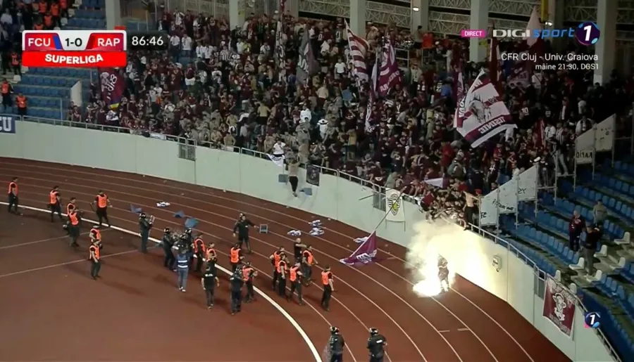 Min. 87: Incidente în tribunele arenei din Târgu Jiu! Suporterii Rapidului aruncă scaune și torțe pe pista de atletism.