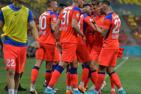 Bucurie a fotbalistilor stelisti dupa un gol marcat cu Florin Lucian Tanase, Ivan Mamut, Andrei Ioan Cordea, Octavian George Popescu si Ovidiu Marian Popescu in meciul de fotbal dintre FC Voluntari si FCSB, contand pentru Play-off-ul Ligii 1 Casa Pariurilor, desfasurat pe Arena Nationala din Bucuresti, sambata 14 mai 2022. © FOTO:Razvan Pasarica/SPORT PICTURES