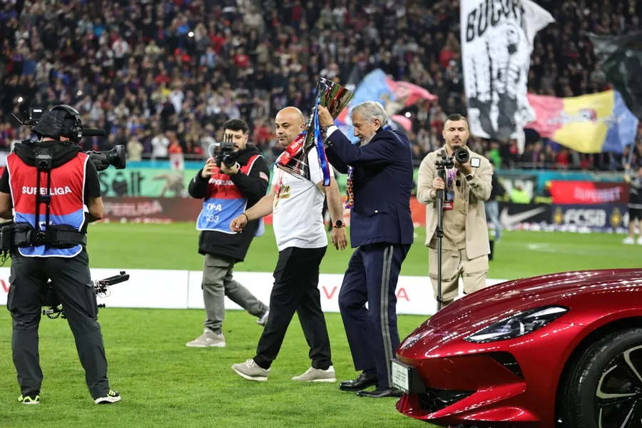 Jucătorii de la FCSB primesc trofeul de campioni ai Superligii, sezonul 2024-2025. Trofeul a fost înmânat de primul lider mondial ATP din istorie, Ilie Năstase.
