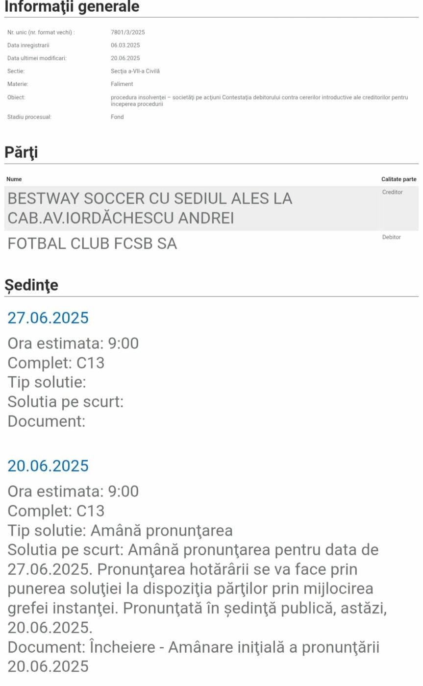 Judecătorul a respins excepția necompetenței generale invocate de FCSB, iar ședința a continuat cu cererea de plată a cauțiunii solicitată de debitoare asupra creditorului care a solicitat deschiderea insolvenței societății care administrează clubul roș-albastru, Bestway Soccer Ltd.