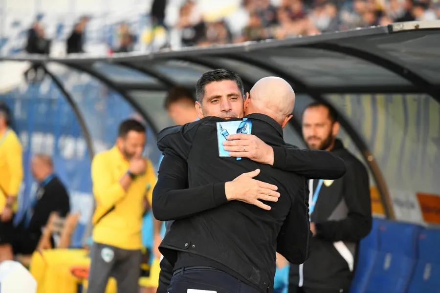 Florin Pîrvu și Leo Grozavu se îmbrățișează la meciul Poli Iași – Petrolul Ploiești. Sursă foto: SportPictures