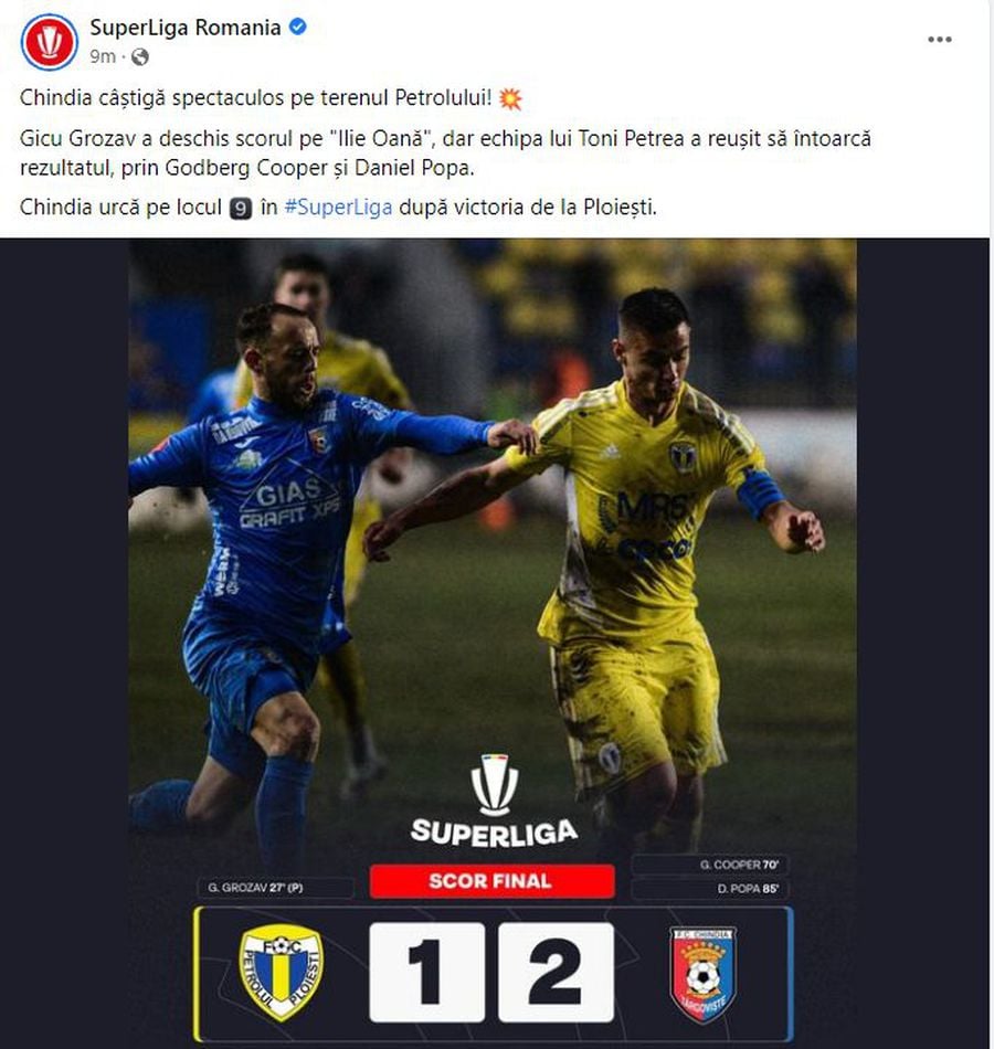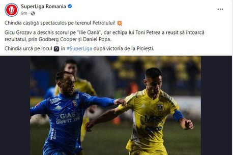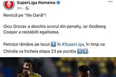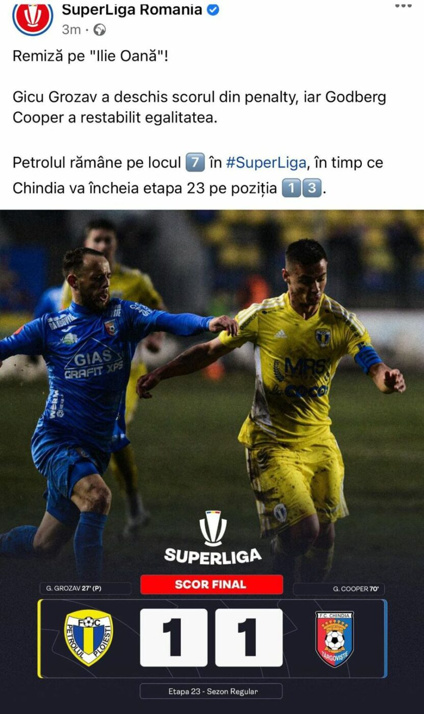 „Remiză pe Ilie Oană! Gicu Grozav a deschis scorul din penalty, iar Godberg Cooper a restabilit egalitatea. Petrolul rămâne pe locul 7 în Superliga, în timp ce Chindia va încheia etapa 23 pe poziția 13”, text alături de care era atașată și o imagine cu scorul final „1-1”.