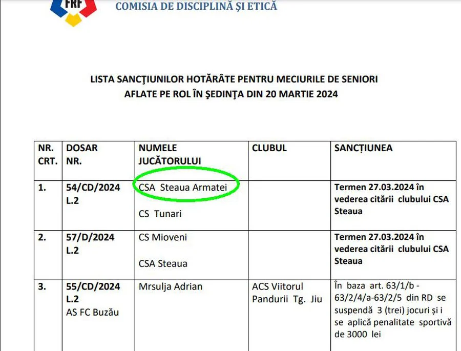 „Puteți să ne spuneți simplu STEAUA BUCUREȘTI! O nouă mărturie a Federației Române de Fotbal că nu respectă STEAUA și pe suporterii steliști. După ce am fost judecați de către comisiile federației cu altă unitate de măsură față de alte cluburi, în spețe identice, avem parte de o nouă dovadă de ”profesionalism” din partea Comisiei de Disciplină și Etică, din cadrul FRF. În tabelul cu lista sancțiunilor hotărâte pentru meciurile de seniori aflate pe rol în ședința din 20 martie 2024, publicat pe site-ul oficial al federației, în dreptul clubului nostru apare denumirea „CSA Steaua Armatei”.