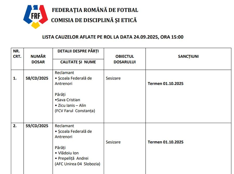 Jean Vlădoiu, Cristian Sava, Ianis Zicu, Andrei Prepeliță au fost reclamați de către Școala de Antrenori la Comisia de Disciplină pentru încălcarea regulamentelor.