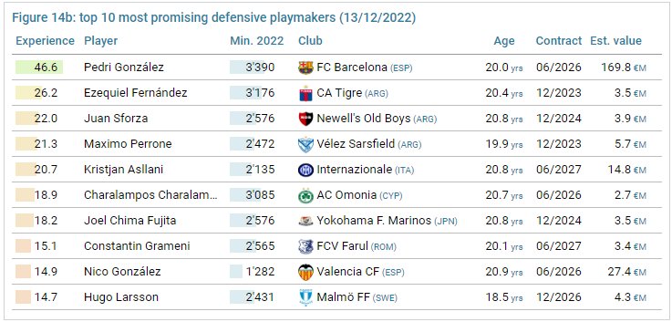 Pe prima poziție se află Pedri Gonzalez de la Barcelona, cu o cotă de 168.9 de milioane de euro, pe doi este Ezequiel Fernandez, jucătorul celor de la Tigre, iar podiumul este completat de către fotbalistul de la Newells Old Boys, Juan Sforza.