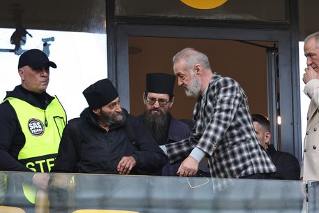 Gigi Becali, patronul echipei FCSB, a venit însoțit de călugări la meciul cu Universitatea Craiova din play-off.