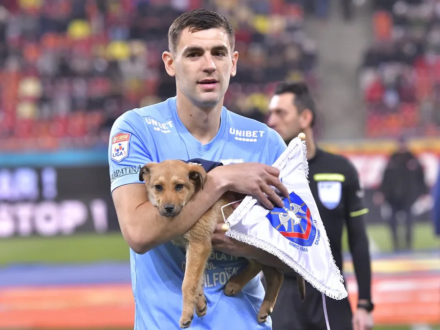 Igor Armaș, cu un cățel în brate, la startul meciului dintre FCSB și FC Voluntari