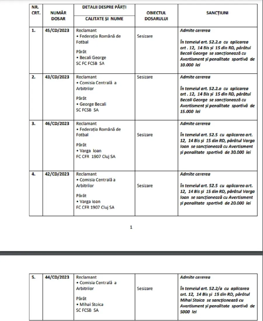 Nu în ultimul rând, și Meme Stoica a primit o sancțiune, în baza unei sesizări formulate de către Comisia Centrală a Arbitrilor la adresa președintelui Consiliului de Administrație de la FCSB, cel mai probabil pentru faptul că acesta l-a „atacat” în mod public pe Kyros Vassaras, după acea conferință de presă în care grecul, din postura de președinte CCA, a încercat să îi apere pe arbitrii acuzați de greșeli foarte mari la momentul respectiv.