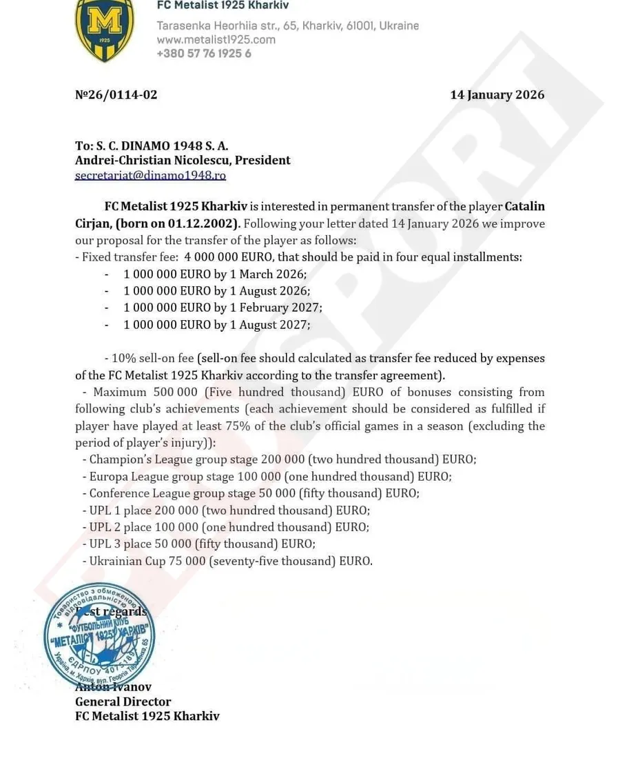 „FC Metalist 1925 Kharkiv este interesată de transferul definitiv al jucătorului Cătălin Cîrjan, (născut la 01.12.2002). În urma scrisorii dumneavoastră din data de 14 ianuarie 2026, mărim propunerea noastră pentru transferul jucătorului după cum urmează: