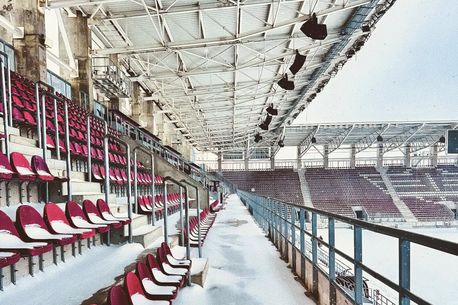 Gazdele s-au folosit de ATV-uri cu lame montate și minitractoare pentru deszăpezirea gazonului. Cel mai probabil, terenul se va prezenta în condiții bune la ora partidei, însă tribunele sunt încă pline de zăpadă, strat și de 15 centimetri.