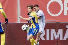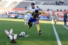 Min. 74: Vali Gheorghe e servit excelent și, deși avea toată poarta în față, s-a precipitat până a fost blocat de un fundaș.