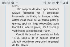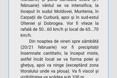 „20 februarie, ora 12:00 – 22 februarie, ora 10:00. Fenomene vizate: intensificări ale vântului, precipitații însemnate cantitativ, ghețuș, polei, ninsori, viscol, strat de zăpadă”, se arată în informarea de cod galben emisă de ANM, care vizează și Bucureștiul.