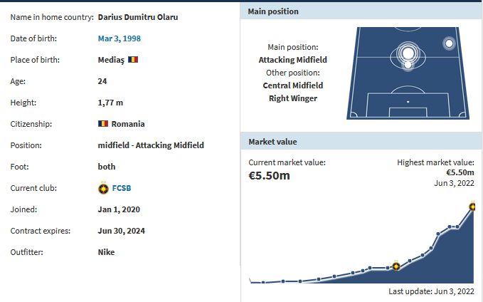 Olaru a a ajuns la FCSB în sezonul 2019 – 2020, pentru 600.000 de euro, de la Gaz Metan, medieșenii urmând a încasa un procent de 20 la sută dintr-un viitor transfer.